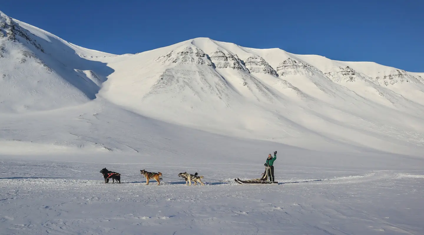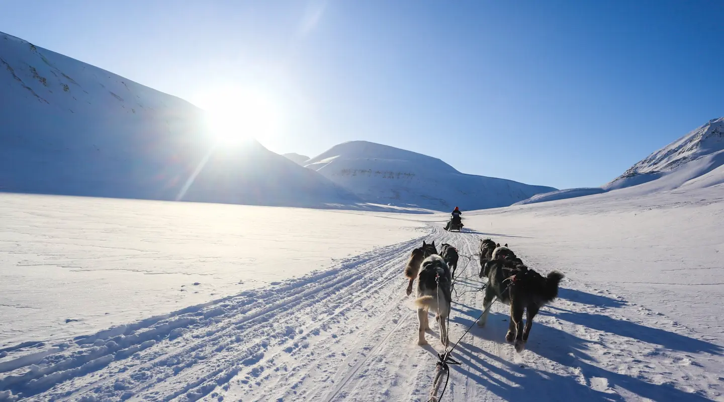Desayunaremos en el Funken Lodge y luego saldremos a vivir una experiencia polar única conduciendo nosotros mismos un trineo tirado por perros (dos personas por trineo). Durante la excursión nos adentraremos en el valle de Bolterdalen hasta llegar al glaciar Scott Turner, donde daremos la vuelta. Con suerte, durante la actividad quizás veremos alguno de los animales típicos de la región, como renos y zorros árticos e incluso alguna aurora boreal. Almorzaremos y después cogeremos una retrac especialmente diseñada para viajar por terrenos nevados y subiremos hasta el glaciar Longyear, desde donde se disfruta de magníficas vistas de la ciudad. Una vez arriba, nos equiparemos con casco y crampones y exploraremos las espectaculares cuevas de hielo que se forman dentro del glaciar.